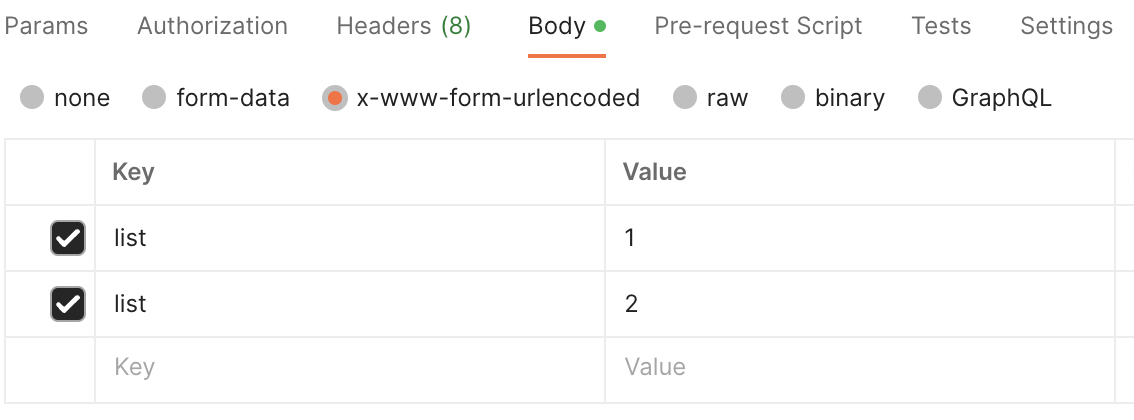 그런데 url-encoded 방식으로 보낼때는 이렇게 list=1&list=2 방식으로 보내면 잘 동작한다.
